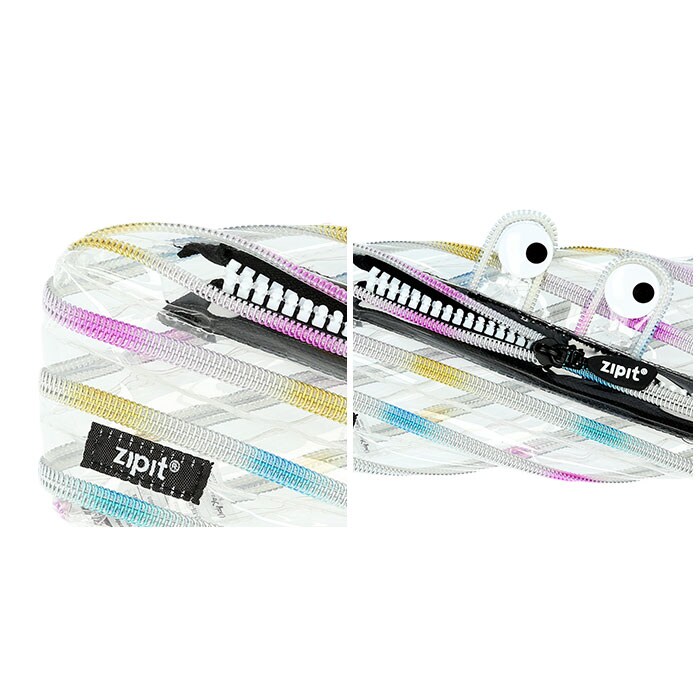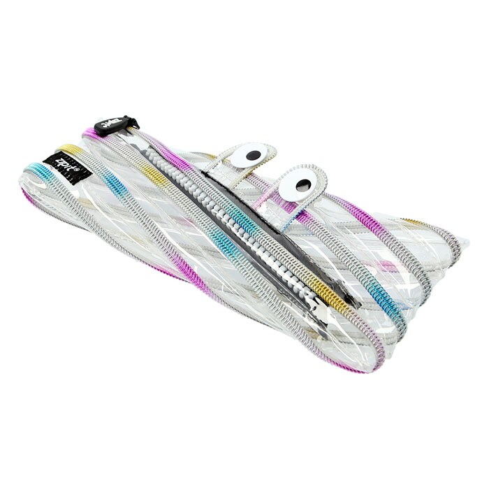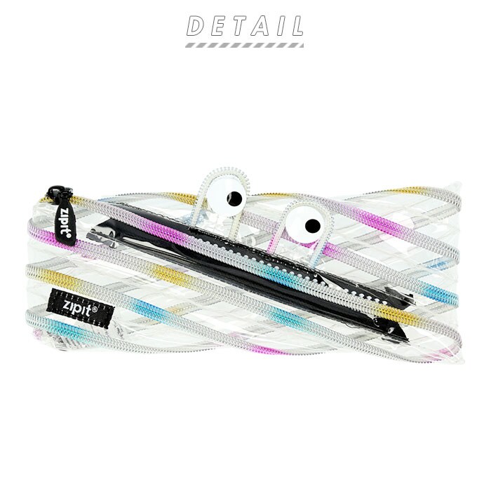 商品説明1本のジッパーがポーチに早変わり!zipitのペンケースポーチが登場。大きな「おめめ」が目を引くデザインでカラフルな色使いと、ファッション性・機能性・楽しさに富んでいる。ジッパーを開け閉めすると、まるでモンスターの歯のように見えてユニーク。手品を見ているような驚きで見ている人を楽しませるアイテム♪ポーチとして使わないときはくるくるとまとめてバッグの中にコンパクトに収納。ペンケースとしてはもちろんのこと、化粧ポーチ、小物入れ等としても◎