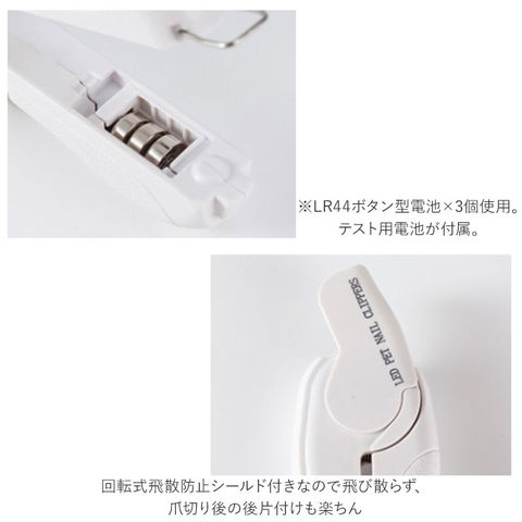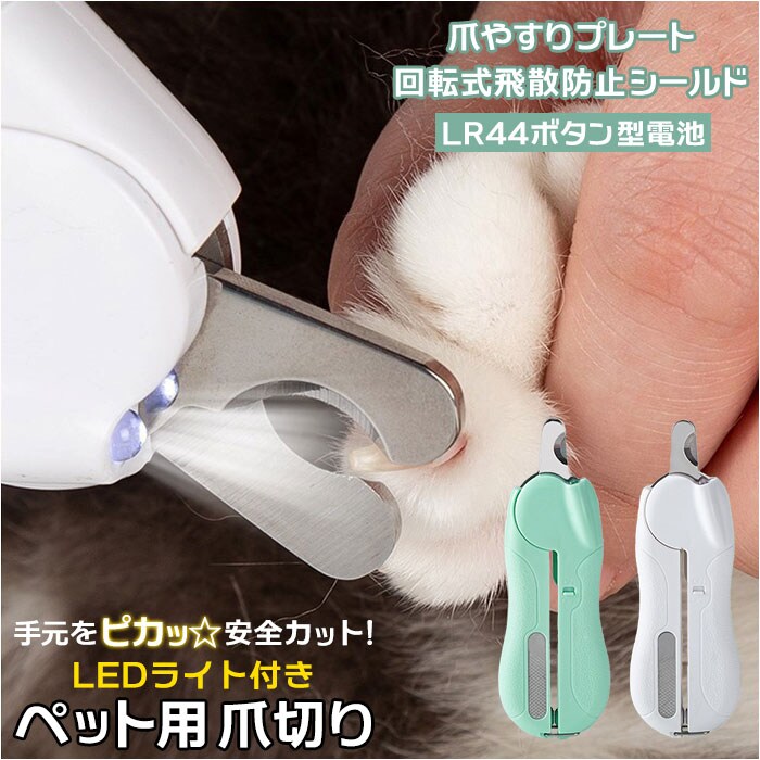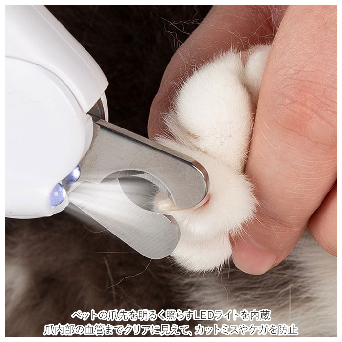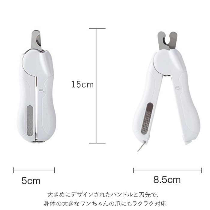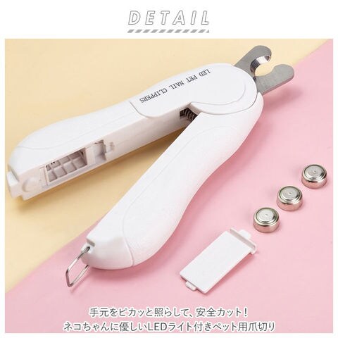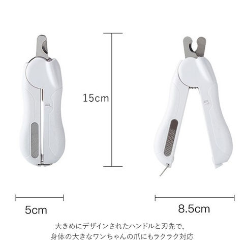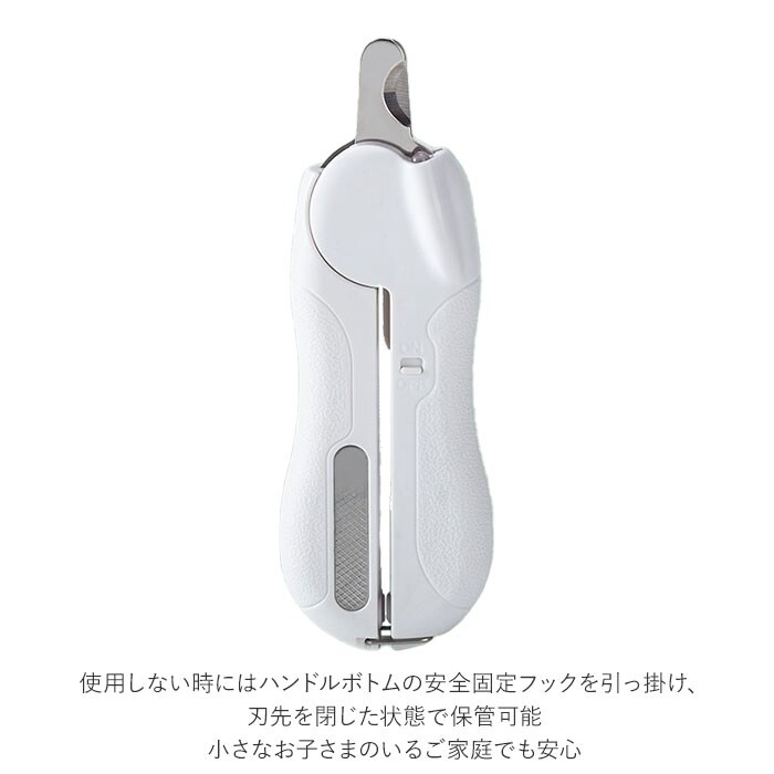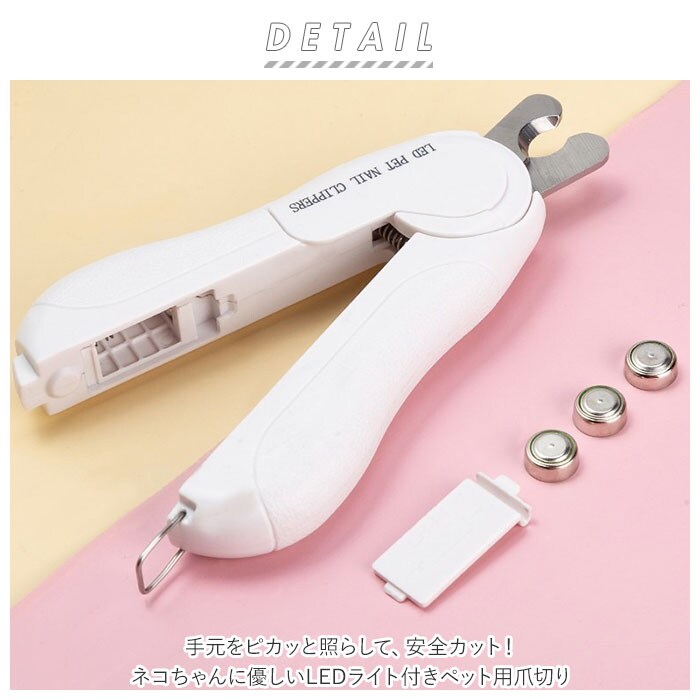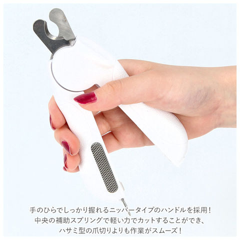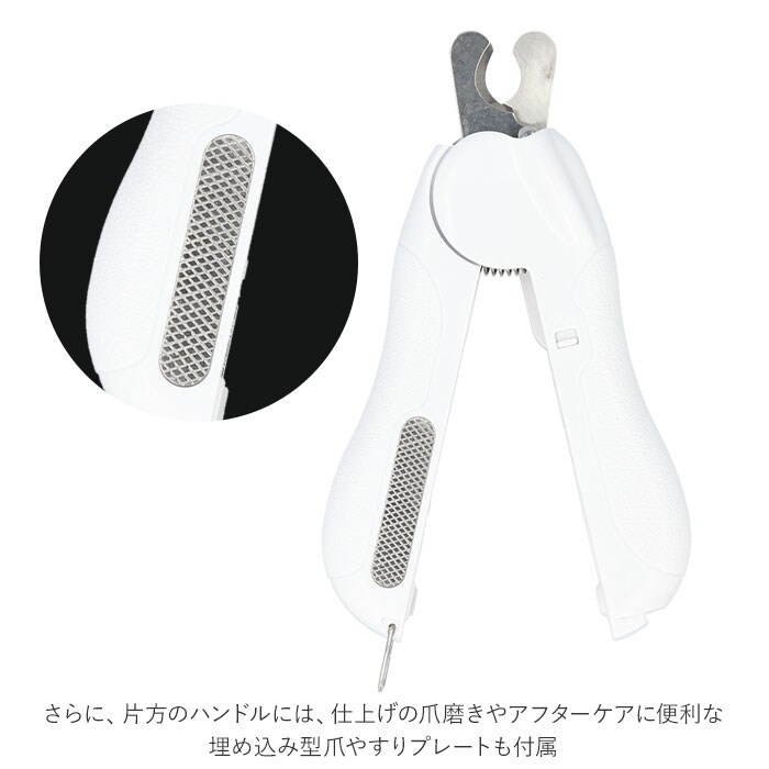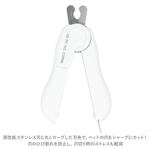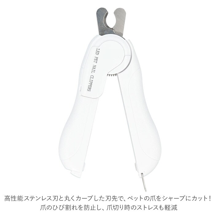 | 商品説明 | 手元をピカッと照らして、安全カット!ネコちゃんに優しいLEDライト付きペット用爪切り。手のひらでしっかり握れるニッパータイプのハンドルを採用!中央の補助スプリングで軽い力でカットすることができ、ハサミ型の爪切りよりも作業がスムーズ!高性能ステンレス刃と丸くカーブした刃先で、ペットの爪をシャープにカット!爪のひび割れを防止し、爪切り時のストレスも軽減。ペットの爪先を明るく照らすLEDライトを内蔵。爪内部の血管までクリアに見えて、カットミスやケガを防止。(※LR44ボタン型電池×3個使用。テスト用電池が付属。)使用しない時にはハンドルボトムの安全固定フックを引っ掛け、刃先を閉じた状態で保管可能。小さなお子さまのいるご家庭でも安心。さらに、片方のハンドルには、仕上げの爪磨きやアフターケアに便利な埋め込み型爪やすりプレートも付属。回転式飛散防止シールド付きなので、爪が飛び散りにくく、爪切り後の後片付けも楽ちん。大きめにデザインされたハンドルと刃先で、身体の大きなワンちゃんの爪にもラクラク対応。 |