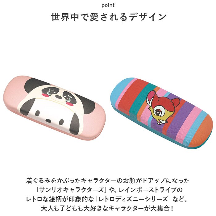 | 商品説明 | いつものカバンに、大好きなキャラをちょこんと忍ばせてお出掛け!大人気キャラクターの絵柄が可愛い「メガネケース」が新登場。【しっかり保護するハードタイプ】丈夫で凹みにくいハードタイプのケースで、大切なメガネの持ち運びが安心。表面は汚れがサッと拭き取れるフェイクレザー貼り。【内側は滑らか起毛素材】ケースの内側は滑らかな起毛素材で仕上げ、メガネを衝撃やキズから守って優しく保管。【世界中で愛されるデザイン】着ぐるみをかぶったキャラクターのお顔がドアップになった「サンリオキャラクターズ」や、レインボーストライプのレトロな絵柄が印象的な「レトロディズニーシリーズ」など、大人も子どもも大好きなキャラクターが大集合!【オフィスでも注目の的に♪】メガネケースをカバンから取り出すたび、誰もがほっこり笑顔に♪メガネ屋さんのシンプルなメガネケースに飽きてしまった方にオススメ! |