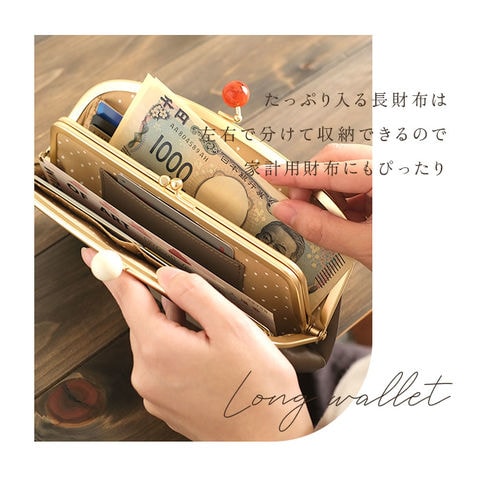 | 商品説明 | 愛らしい丸いフォルムが目を引く!zucchero filato(ズッケロフィラート)の、がま口長財布が登場。牛革を使用!本革ならではの良さを感じながら、長く愛用できる長財布。飴玉のようなツヤ感のあるアクリル玉がアクセント♪がま口はワンタッチで大きく開閉するので、中身が取り出しやすい!内側にはがま口タイプの小銭入れ×1、お札入れスペース×2、カードポケット×12、フリーポケット×2と抜群の収納力。また真ん中に配置された小銭入れの両側面には、外側と同じ本革を使用したカードポケットが一つずつ付いており、使用頻度の高いカードを入れておくことができる。内側全体にドット柄の生地を使用しており、女性らしい仕上がりに!鮮やかなカラーバリエーション♪アンティークゴールドの金具との組み合わせがおしゃれさをアップしてくれるアイテム。zucchero filatoのロゴが入った、クラフトボックス入りなので、お世話になった方へのプレゼントにもおすすめ◎ |