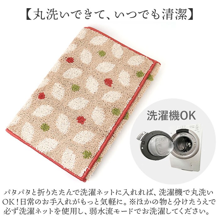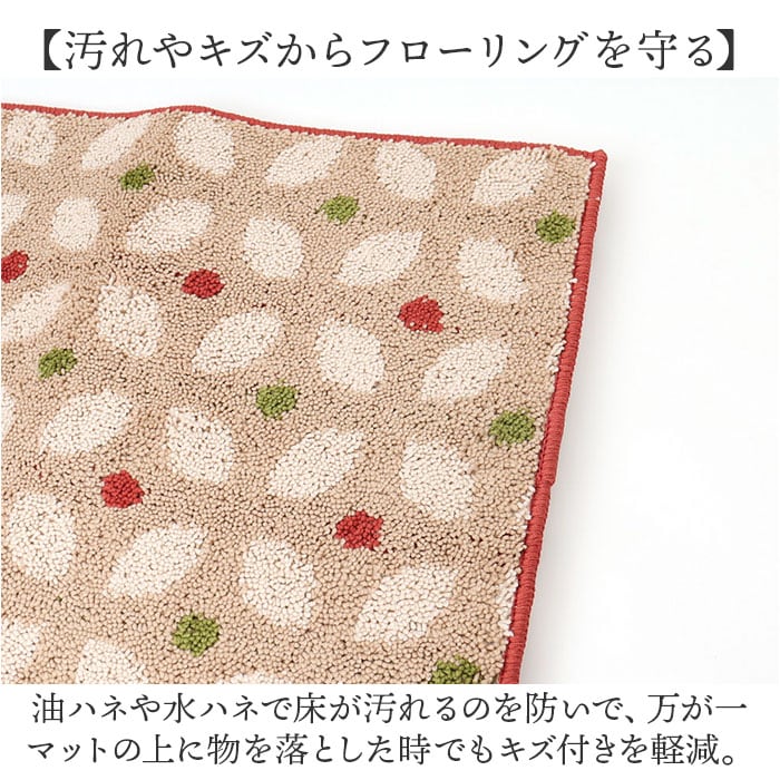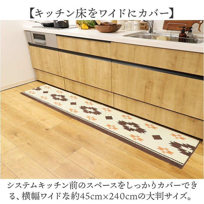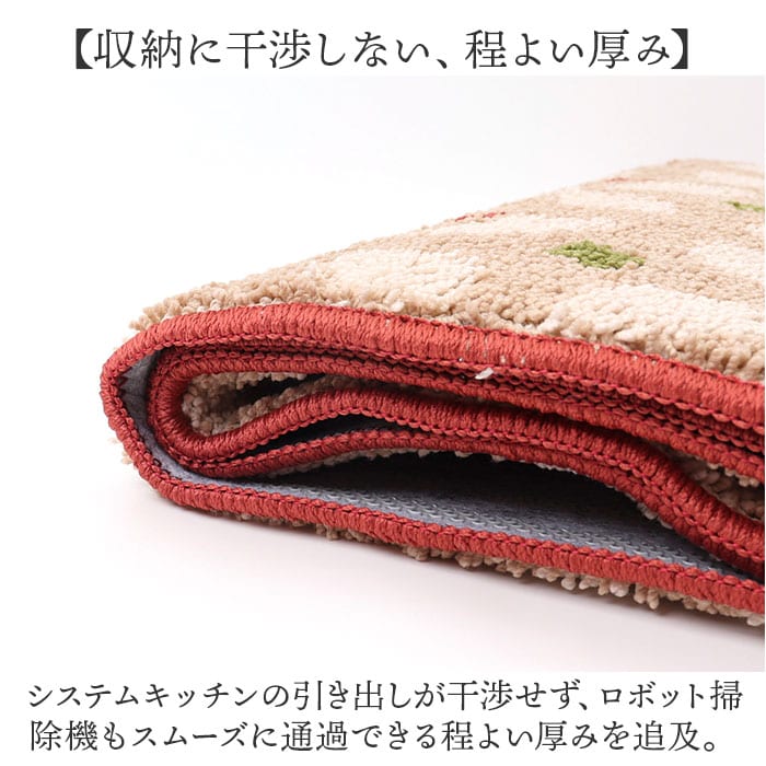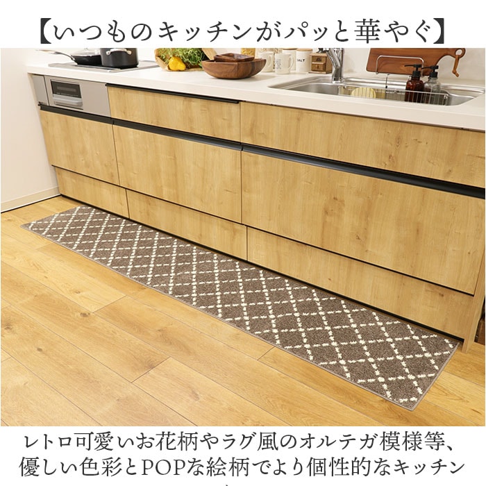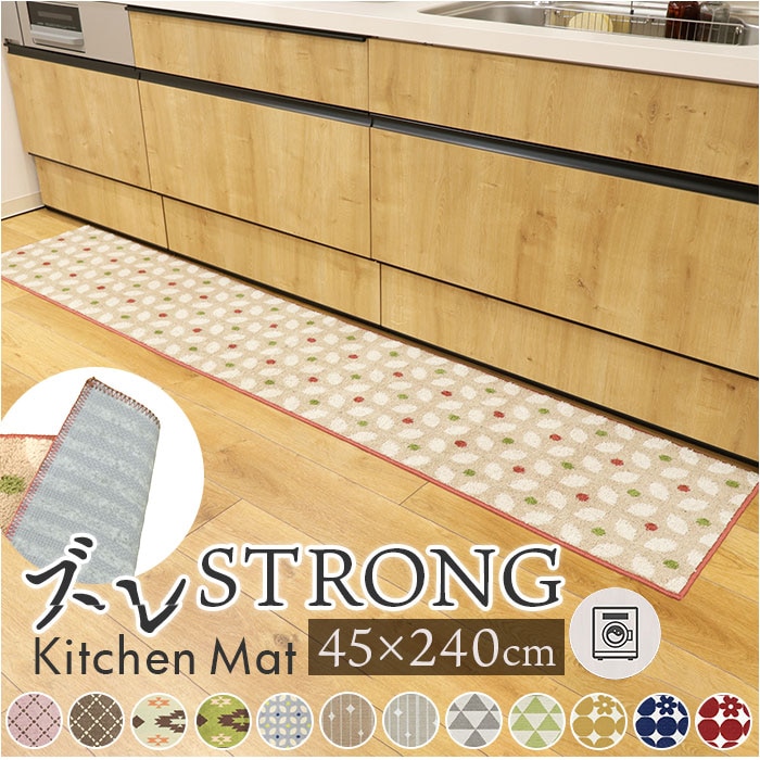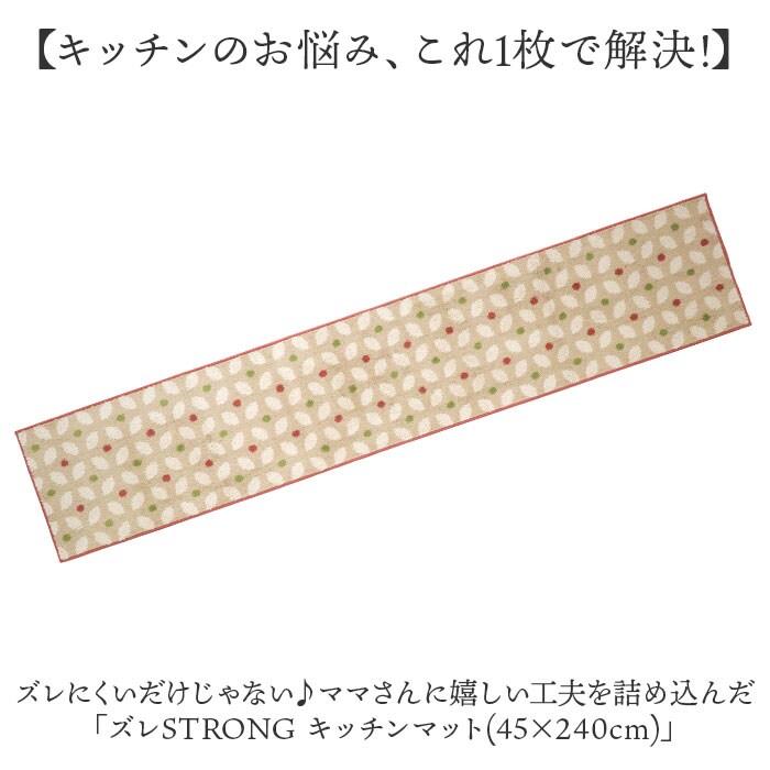 | 商品説明 | 【キッチンのお悩み、これ1枚で解決!】ズレにくいだけじゃない♪ママさんに嬉しい工夫を詰め込んだ「ズレSTRONG キッチンマット(45×240cm)」【汚れやキズからフローリングを守る】油ハネや水ハネで床が汚れるのを防いで、万が一マットの上に物を落とした時でもキズ付きを軽減。【ふんわりソフトな踏み心地】踏み心地ふんわり♪柔らかポリエステルのパイル毛が、キッチンでの立ち仕事で疲れた足をサポート。【滑り止め効果3倍で、ズレに強い】裏面は滑り止め効果の高いTPR素材のボーダー加工済み。掃除機をかけてもズレにくくストレスフリー。※メーカー従来品に比べ、約3倍ズレにくい滑り止め加工を採用。【床暖房にも、もちろん対応】耐熱温度が比較的高いTPR樹脂で底面を加工してあるため、床暖房のフロアにもきちんと対応!【丸洗いできて、いつでも清潔】パタパタと折りたたんで洗濯ネットに入れれば、洗濯機で丸洗いOK!日常のお手入れがもっと気軽に。※ほかの物と分けたうえで必ず洗濯ネットを使用し、弱水流モードでお洗濯してください。【収納に干渉しない、程よい厚み】システムキッチンの引き出しが干渉せず、ロボット掃除機もスムーズに通過できる程よい厚みを追及。【キッチン床をワイドにカバー】システムキッチン前のスペースをしっかりカバーできる、横幅ワイドな約45cm×240cmの大判サイズ。【いつものキッチンがパッと華やぐ】レトロ可愛いお花柄やラグ風のオルテガ模様等、優しい色彩とPOPな絵柄でより個性的なキッチンに。 |