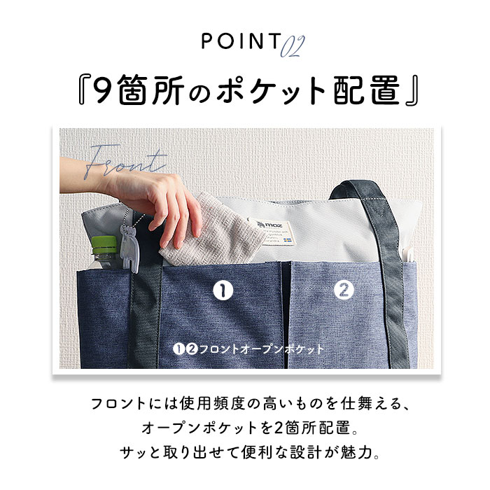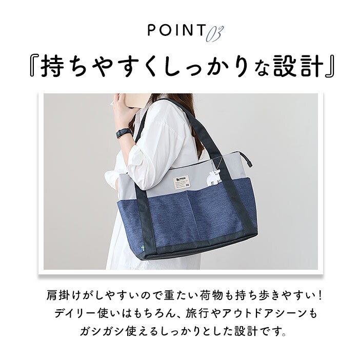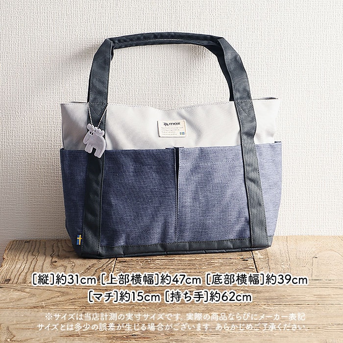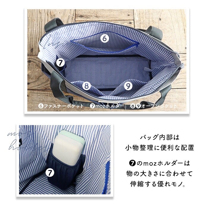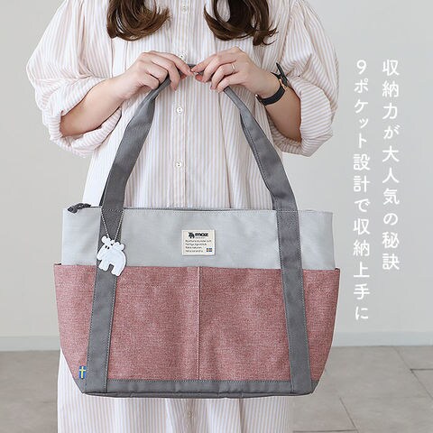 | 商品説明 | 北欧ブランド「moz(モズ)」から収納力抜群なトートバッグが新登場。外側・内側合わせて9個のポケット付きで、小物の整理整頓もしやすいトートバッグ。ストライプ柄の内生地を使用しており、中身が確認しやすいのもポイント。開口部は天ファスナー式。中身のこぼれ落ちを防ぎ、プライバシーを確保。内側はB4サイズがすっぽりと収まり、1泊旅行も可能な大きさ◎ファスナーポケット×1、オープンポケット×2、中に入れる物の大きさに合わせて伸びるモズポケット×1を装備!前面に2つ、両サイドに1つずつ、背面に1つのオープンポケットを配置!持ち手は厚手のアウターの上からも肩掛けやすいよう、長めに設計。mozのトレードマーク「エルク」(ヘラジカ)のイラスト入りブランドロゴタグがアクセント。ヘラジカモチーフのリフレクトチャーム付き♪お出かけや通勤・通学用としてはもちろん、マザーズバッグとしても活躍! |
