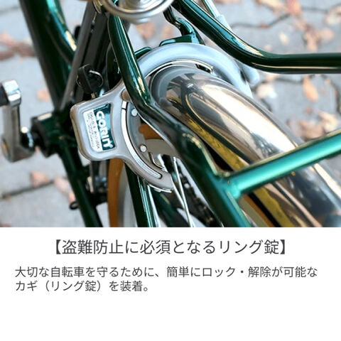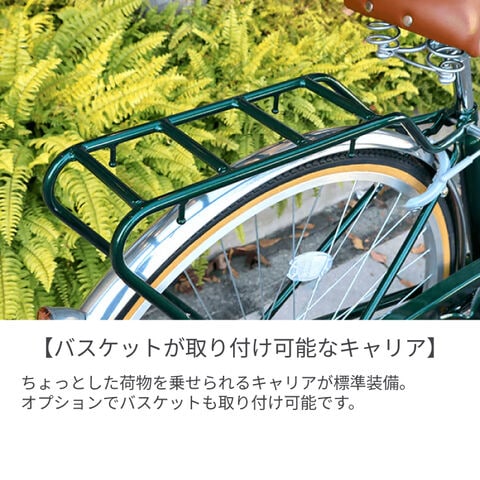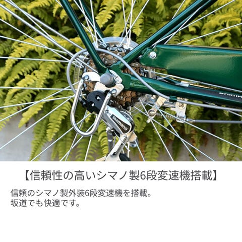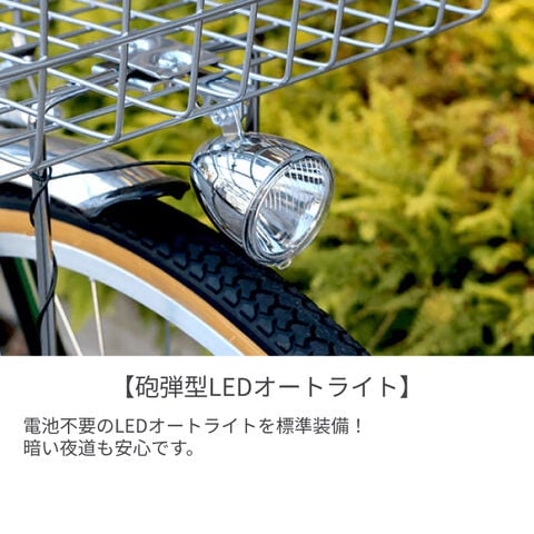 ストレートでシンプルなフレーム形状に落ち着いたベーシックカラー。飽きのこない組み合わせで、長く使えるおすすめのシティサイクルです。クラシカルなテリー型サドルと砲弾型ライトがおしゃれで見た目もGOOD。LEDオートライトは、光センサーが暗さを判断してON/OFFを切り替えます。夜間はもちろん、曇っている場合は日中でもライトがつくので安心です。加えて、フロントリフレクターを装備しているので夜間の視認性もばっちり。さらに6段変速機、LEDオートライトと便利な機能も標準装備しています。
