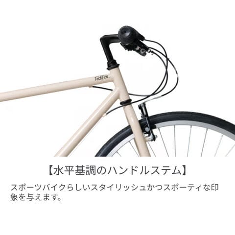 お手頃価格ながらこだわりのクロスバイクを、サイマオリジナル自転車「Toffee」は日常に溶け込むシンプルなデザイン。細身のスチールフレームにさりげないワンポイントロゴがどんなシーンやファッションにも合うルックスを成立させています。ひと漕ぎで良く進むやや大きめの前46Tギアを採用しブレーキには高い制動力を誇るVブレーキを選択。そしてステムの角度にこだわり地面と水平にすることでスポーツバイクらしいスタイリッシュかつスポーティな印象を与えています。