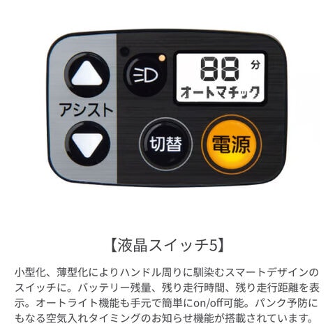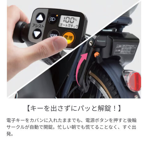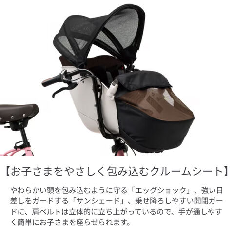 PanasonicとCombiがコラボして開発したチャイルドシートを採用した「ギュットクルームEX」コンビが独自で開発した衝撃吸収素材を使用した、「エッグショック」は卵すら傷つけないほどの衝撃吸収性で赤ちゃんの頭をしっかり守ります。グリップには柔軟性のある素材を利用したため、振動やうたた寝で頭をぶつけてしまったときも衝撃を和らげます。また、快適性や乗せおろしのしやすさを考えた新設計のチャイルドシートがお子様の体をまるでお母さんの腕の中のように包み込みます。電子キーをカバンなどに入れたままでもボタン一つで開錠できる「ラクイック」は忙しい朝や、荷物が多い時でも素早く出発できます。大容量の16.0Ahのリチウムイオンバッテリーは、遠くでお出かけできる長距離走行性を持ちながら面倒な充電の手間も軽減します。歩道橋や人通りの多い場所でもお子さまを乗せながらラクラクアシストしてくれる「押し歩きモード」搭載。お子様への愛情をギュット詰め込んだ1台です。