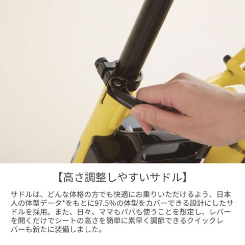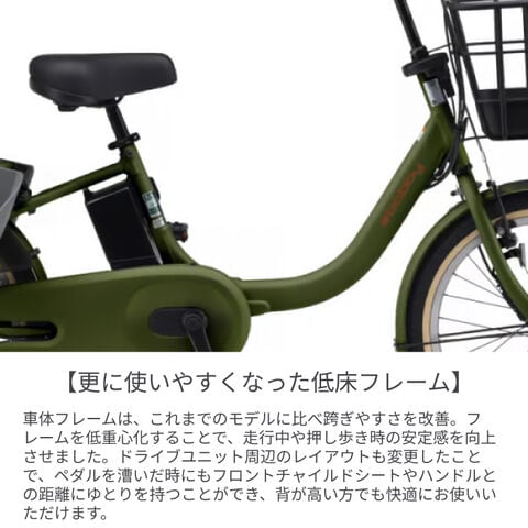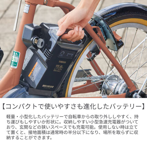 より長く走れて充電回数も少なくて済む、15.8Ah大容量バッテリーを搭載した子乗せモデルです。毎日の色々な場面で負担に感じる車体の重さを少しでも軽減するために、軽さ・取り回しのしやすさにこだわって設計されました。安全性とデザイン性を両立したチャイルドシート採用でさらに便利に安全に!軽量コンパクトな車体に安定感のある幅広タイヤ、てこの原理でラクにかけられるスタンド、バッテリーもお子様を抱っこしながら片手で持ち運びがラクラクできる形状に。など使いやすさも考え抜いた設計になっています。