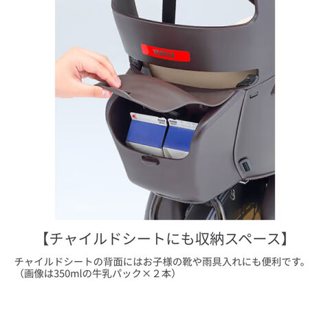 より長く走れて充電回数も少なくて済む、15.8Ah大容量バッテリーを搭載した子乗せモデルです。毎日の色々な場面で負担に感じる車体の重さを少しでも軽減するために、軽さ・取り回しのしやすさにこだわって設計されました。安全性とデザイン性を両立したチャイルドシート採用でさらに便利に安全に!軽量コンパクトな車体に安定感のある幅広タイヤ、てこの原理でラクにかけられるスタンド、バッテリーもお子様を抱っこしながら片手で持ち運びがラクラクできる形状に。など使いやすさも考え抜いた設計になっています。
