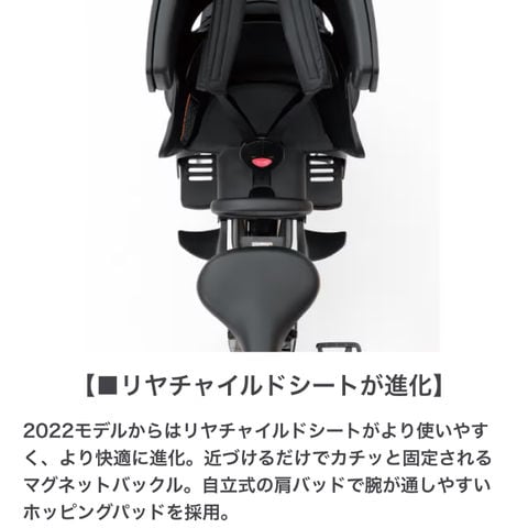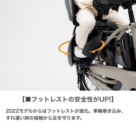 より長く走れて充電回数も少なくて済む、15.4Ah大容量バッテリーを搭載した子乗せモデルです。毎日の色々な場面で負担に感じる車体の重さを少しでも軽減するために、軽さ・取り回しのしやすさにこだわって設計されました。安全性とデザイン性を両立したチャイルドシート採用でさらに便利に安全に!軽量コンパクトな車体に安定感のある幅広タイヤ、てこの原理でラクにかけられるスタンドなど使いやすさも考え抜いた設計になっています。