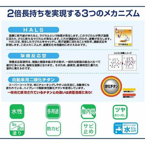 ●特徴:特殊フッ素樹脂、シリコンアクリル樹脂のシリコン架橋システム及び紫外線劣化防止剤(HALS)の相乗効果により、汚れにくく、耐久性が格段に優れた高性能塗料です。