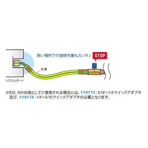 ●注意事項:※R32、R410A用としてご使用される場合には、Y19173:5/16"メス×1/4'オスクイックアダプタ及び、Y19174:1/4"メス×5/16"オスクイックアダプタが必要となります。