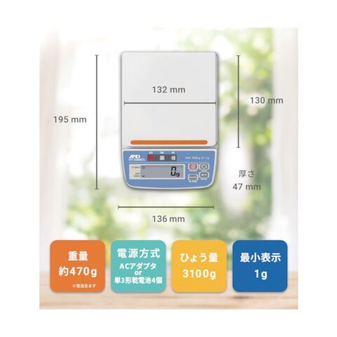 ●秤量(g):3100●幅(mm):136●奥行(mm):195●最小表示(g):1●高さ(mm):47●載皿寸法(mm):132×130●電源:ACアダプター(付属)、または単3乾電池×4個(別売)