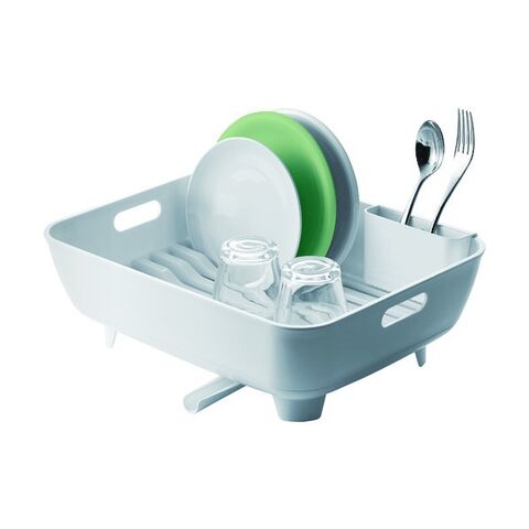 美しいフォルムの水切りかご。縦置き・横置き兼用。可動式排水口付き。横置き・縦置きOK。止水栓付き。トレーと本体は分離します。銀イオンの抗菌仕様(止水栓を除く)。カトラリースタンド付き。