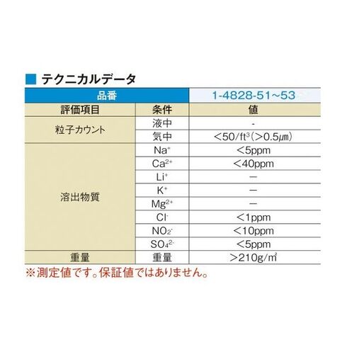 ●抽出イオン:Na+5ppm以下、Ca2+40ppm以下、CL-1ppm以下、NH4+5ppm以下、NO2-10ppm以下、SO4^2-5ppm以下
