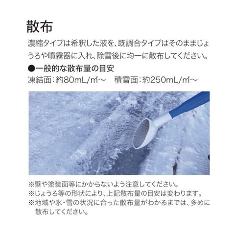 ●除雪後の凍結面または圧雪面にジョウロなどで散布するだけで滑りにくい路面になります。