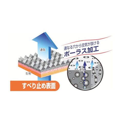 ・独自の通気ゴム素材「ポーラス加工」により、手のひらでも通気するのでムレを軽減します。