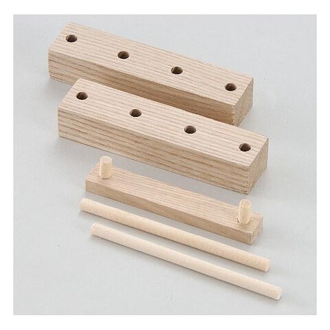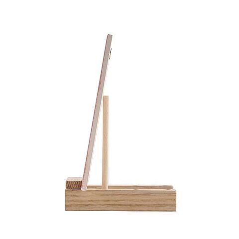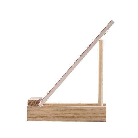 丸棒の位置によって作品の角度が変えられます。台を広げて八の字にすると、大きな作品も飾れます。棒の位置をかえると作品の角度が変わります。ベース×2、丸棒×2、ジョイント×1ベース:105×25×20mm(4か所穴アキ)、丸棒:φ6×100mm、ジョイント:90×15×17.5mm