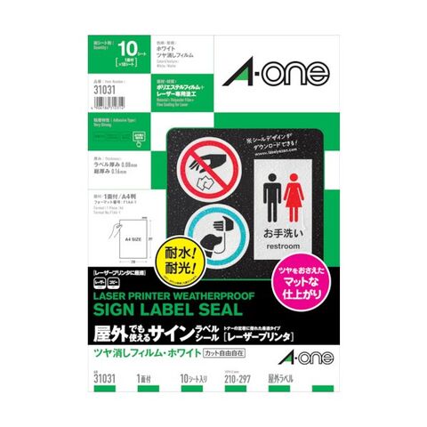 エーワン 屋外用サインラベル(レーザープリンタ)ツヤ消しフィルム・ホワイト1PK ●規格:A4判 (210×297mm)_x000D_ ●一片サイズ:210mm×297mm 31031 1PK