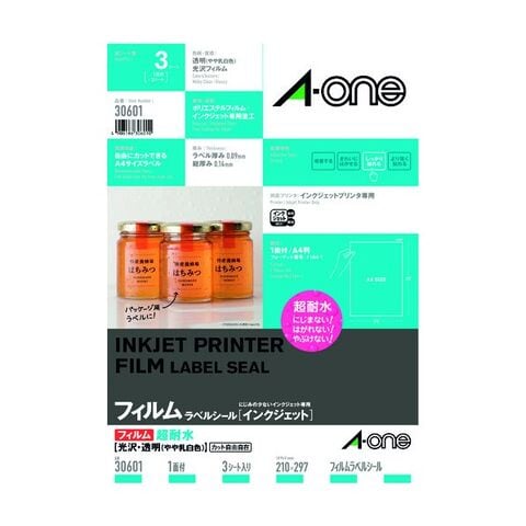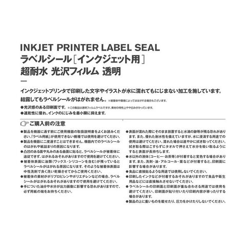 【仕様】 ●規格:A4判1面 ●1片寸法:縦297×横210mm ●紙種:ポリエステルフィルム,インクジェット専用塗工 ●総紙厚:0.14mm 濡れても、にじまず、はがれず、やぶれない。 かんたん手作り超耐水ラベル。