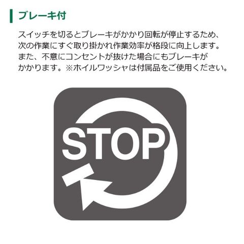 標準付属品:サイドハンドル、レジノイドフレキシブルトイシ、スパナ、六角棒スパナ