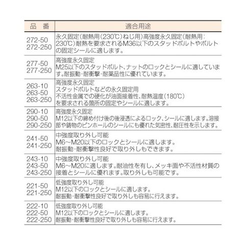 ●適合用途:永久固定(耐熱用(230℃)ねじ用)耐熱を要求されるM36以下のスタッドボルトやボルトの固定シールに適します。