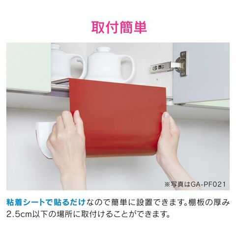 ◆吊戸棚などの棚板に貼り付けるだけで、簡単にキッチンペーパーの設置スペースを確保できます。