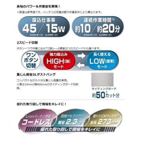 ●標準付属品:バッテリBL1430・充電器DC18RA付・ホース(2.5m/A-51306)・フロントカフス22・ノズルアッセンブリ(132025-7)・ダストバッグコンプリート(A-51312)・ショルダーベルト