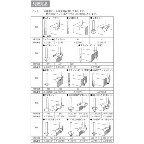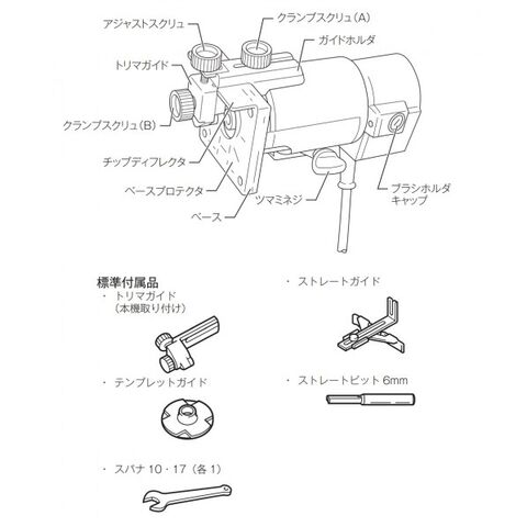 ●標準付属品:ストレートビット6・ストレートガイド・テンプレットガイド・トリマガイド・スパナ10(781003-0)・スパナ17(781008-0)(各1本)