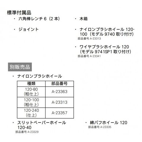 ●標準付属品:木箱ケース付・ナイロンブラシホイール付・ナイロンブラシホイール(A-23313)・六角棒スパナ6(2本)・ジョイント(弊社集じん機接続用)