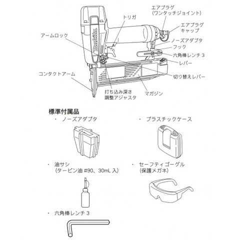 ●標準付属品:ノーズアダプタ・六角棒スパナ3・セフティゴーグル・油さし
