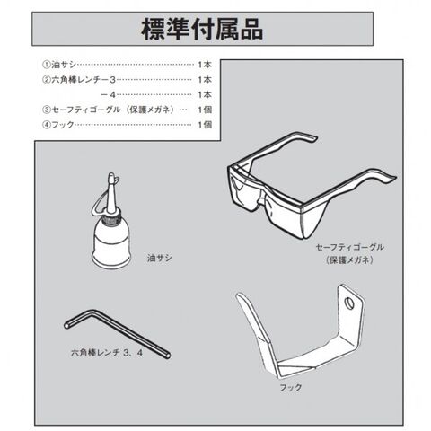 ●標準付属品:六角棒スパナ3・4(各1本)・セフティゴーグル・フック・油さし