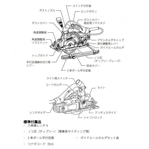 ●標準付属品:チップソー付・チップソー(A-50083)(チップソー付仕様のみ)・2本ポール平行定規・ガイドルールホルダ・六角棒スパナ5・(783203-8)・ツナギコード5m