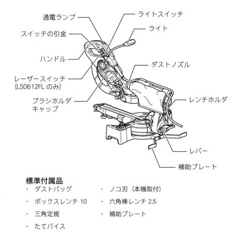 ●標準付属品:チップソー/LEDライト付・チップソー(A-50762)・ダストバッグ・ボックスレンチ10(782223-9)。
