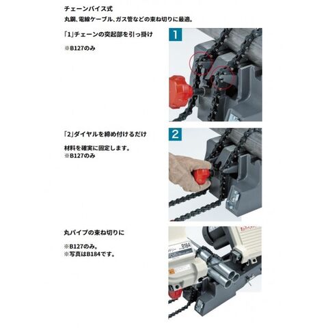 ●標準付属品:チェーンバイス式・ノコ刃(14山/インチ・ハイス)1本・両口スパナ10・六角棒スパナ(工具袋付)