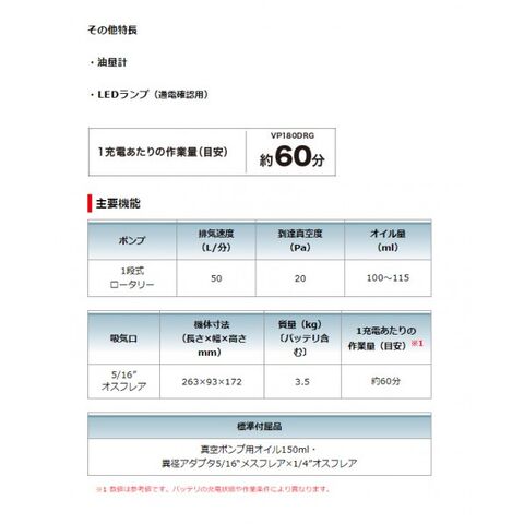 ●標準付属品:真空ポンプ用オイル150ml・異径アダプタ5/16“メスフレア×1/4”オスフレア ※バッテリ、充電器、ケース別売