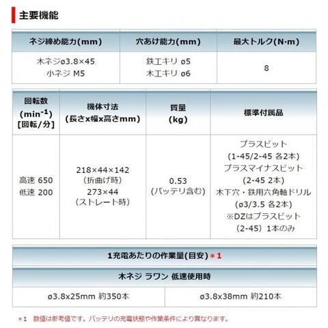 ●標準付属品:(+)ビット2-45 ※バッテリ・充電器・ケース別売