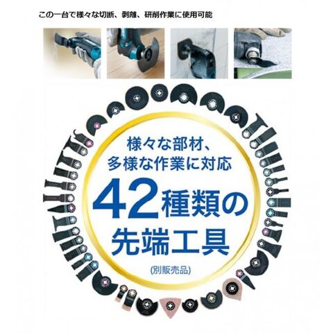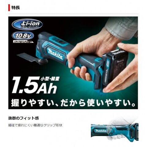 ●標準付属品:バッテリBL1015・充電器DC10SA・ケース付・カットソーTMA047(A-63797)・サンディングパッド(A-59405)・サンディングペーパー(木工用#60/#120/#240各2枚)・六角棒スパナ・ツールボックス
