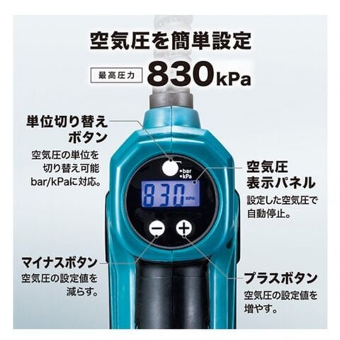 | カラー | 青 | 付属品 | バッテリBL1015、充電器DC10SA、ケース、米式チャック(本機取付)、英式バルブ用アダプタ(本機取付) 仏式バルブ用アダプタ、ボール用アダプタ、浮き輪用アダプタ |