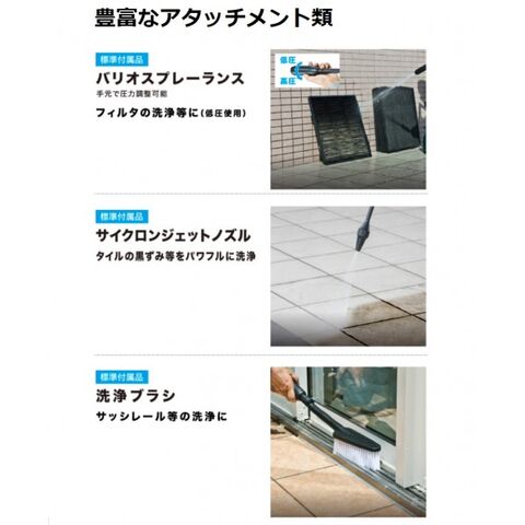 ●標準付属品:多機能収納ケース付・トリガガン・高圧ホース5m・バリオスプレーランス・洗浄ブラシ・サイクロンジェットノズル・泡ノズル・耐圧ホース3m(水道ホース)・吸水コネクタ・ワンタッチジョイント(2個)・ホースクランプ・ノズル穴掃除ピン・自吸ホースセット(ストレーナ・吸水フィルタ付) ※バッテリ、充電器別売