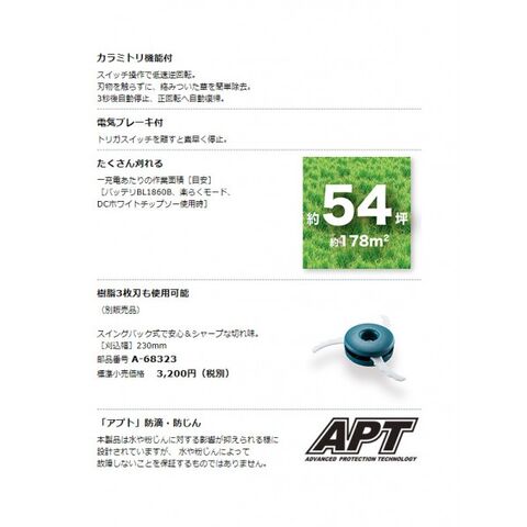 | カラー | 青 | 付属品 | バッテリ、充電器、チップソー(刈刃)、飛散防護カバー、刃物(刈刃)カバー、肩掛けバンド、保護メガネ、ボックスドライバー、六角棒スパナ4、アクセサリバッグ |
