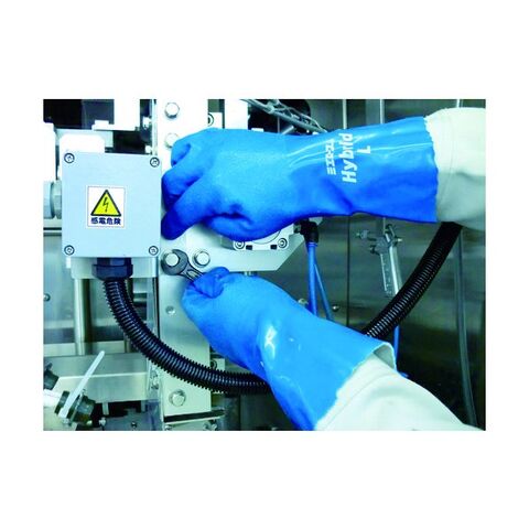 業界初の塩ビとニトリルゴムのブレンド樹脂(ハイブリッド配合)で、塩ビ手袋の耐油性と天然ゴム手袋のやわらかさを兼ね備えた手袋です。
