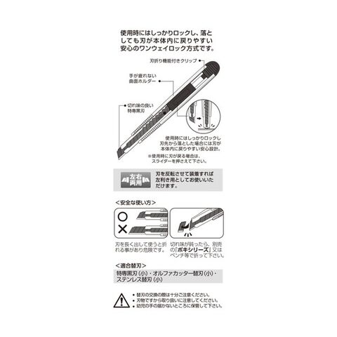 新方式オートロックは、使用時にはしっかりロックし、落としても刃がホルダー内に戻りやすい安心設計です。