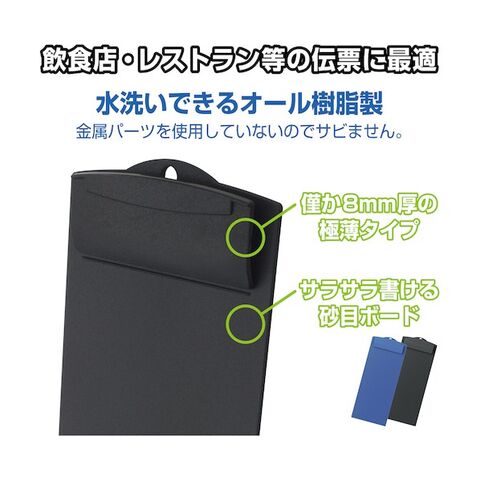 ●飲食店・レストラン等の伝票に最適です。●オール樹脂製、汚れても水洗いできて清潔です。●薄さ僅か8mmの極薄タイプです。●色:黒●縦(mm):239●横(mm):98●サイズ(mm):W98XD239XH8mm●厚さ:8mm●使用紙サイズ:W90XD210mm●上部丸穴付(7mm)●本体:再生ABS