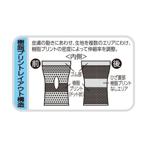 3D動態解析技術に基づいた樹脂プリントレイアウト構造でひざの動きに追随し、ズレにくいサポーターです。