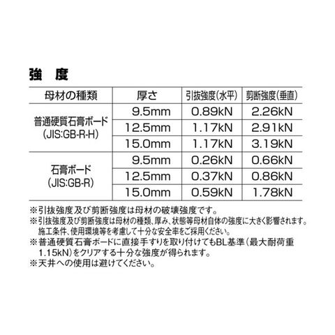●引張最大荷重:0.26kN/0.37kN(石こうボード厚み9.5mm/12.5mm)