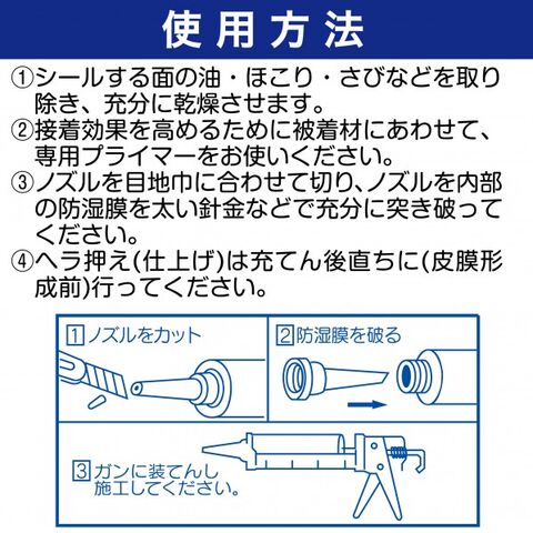 | 用途 | 〔1〕ガラス・サッシまわりの目地シール 〔2〕室内間仕切り・化粧目地のシール 〔3〕船舶・冷凍庫などの目地シール ※接着しない材料もございますので、事前にご確認ください。 |