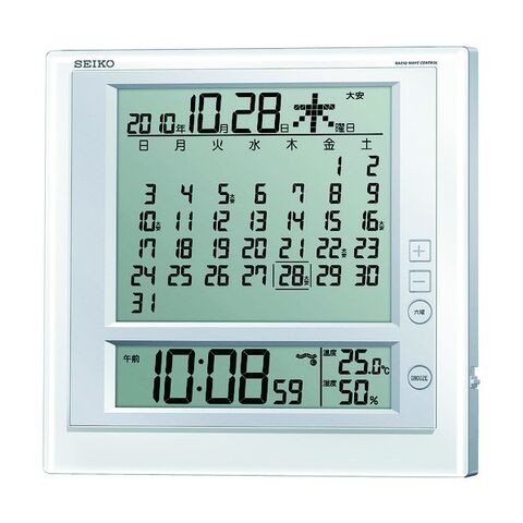 ●月めくりや六曜表示など便利な機能が充実したデジタル電波時計です。●電波修正機能(40kHz/60kHz自動選局)付です。●大型液晶にマンスリーカレンダー表示と六曜表示です。●2099年までのフルオートカレンダー機能付です。●温湿度表示機能付です。●オフィスのカレンダーとして事務所の受付に最適です。●幅(mm):170●奥行(mm):25●高さ(mm):170●電池寿命:約1年●電源:単3マンガン乾電池×2本(付属)●プラスチック枠(白パール)●前面:ガラス●電波修正機能付●温度湿度表示機能付●電池切れ予告機能付●アラームオートストップ機能付●カレンダー開始曜日切替(日曜もしくは月曜)●ダンダントーンアラーム(4段階)付●アルカリ単3電池×2本●置用スタンド