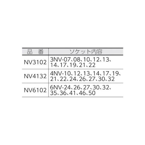 ●差込角(mm):12.7●ソケット内容:4NV-10、12、13、14、17、19、21、22、24、26、27、30、32●ハンドル内容:エクステンションバー(NE40-150)、ボールジョイント(NJ40)