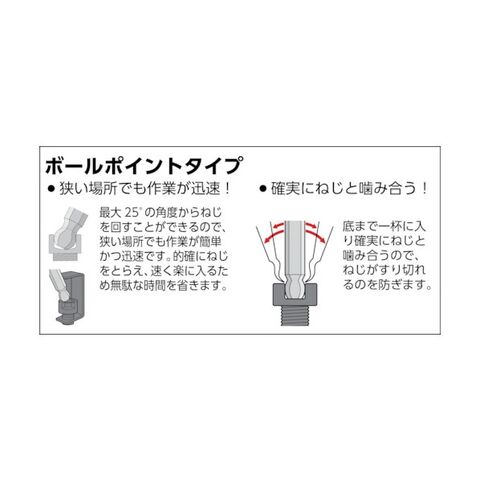 ●六角棒の先端の平面かどは各辺均等に面取りを行っています。六角穴への差し込みが一層容易となり、しかも面取り角度は六角穴底の「かどすみ」に密着するよう考慮してあります。