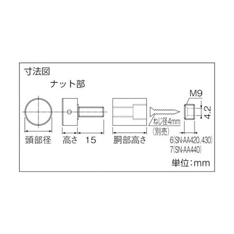 ●壁面に座金をねじ径4mmの皿タッピング(別売り)で打ち付け、サインナットで胴部を座金に取り付けます。取付物に使用するサインナットに合わせた下穴をあけ、サインナット頭部のねじ部を通し、頭部を胴部に取り付けてください。取り付けの際には、専用鍵を頭部鍵穴に差し込み、頭部が空転しない状態で取り付けを行ってください。取り付け後、頭部より専用鍵を抜き取ってください。