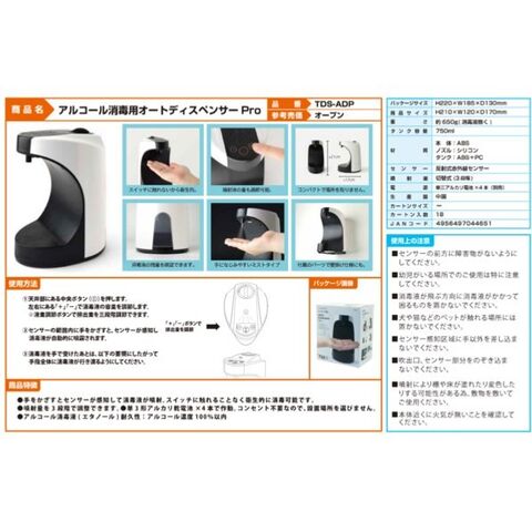 高森コーキ アルコール消毒用オートディスペンサー Pro H210×W120×D170mm ブラック/ホワイト TDS-ADP 1台